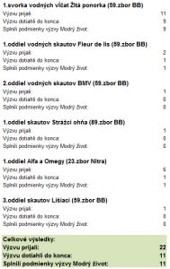 Už je to nejaký čas a tochu sa nám to vyhodnotenie predĺžilo. No nešlo do zabudnutia a konečne sme sa dopracovali k výsledkom. Do výzvy sa nám zapojilo 22 skautov, od vĺčat až po dospelých, zo šiestich skautských zborov a z dvoch miest. Do absolútneho konca výzvu dotiahla presná polovica a zaujímavosťou je, že všetci, ktorí vytrvali až do konca, zvádli aj podmienky výzvy Modrý život. Všetkým gratulujeme a ako ODMENU im venujeme nášivku výzvy Modrý život GRÁTIS!